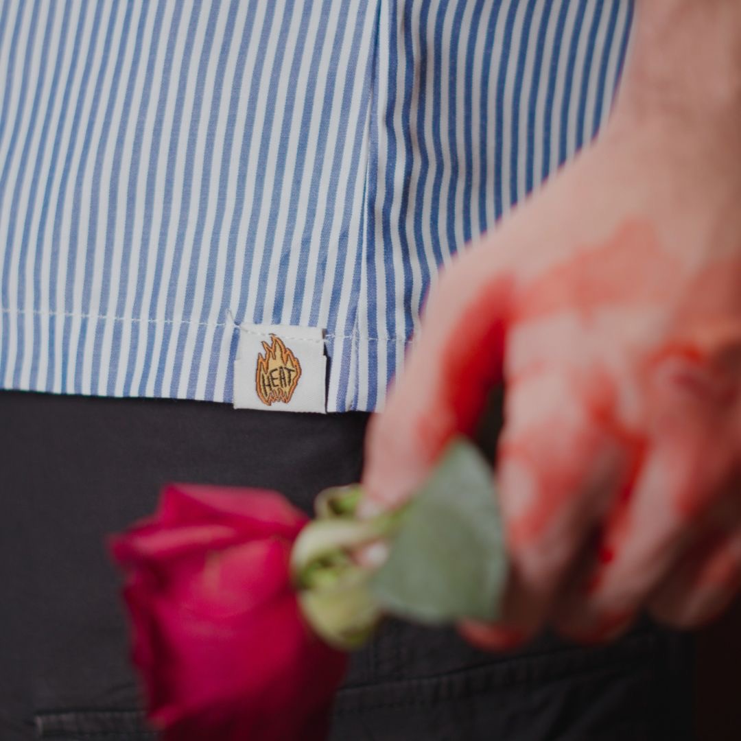 crafted from blue cotton with white stripes, this office shirt redefines professional wear. featuring bold screen-printed artwork on the back, it’s designed to bring comfort and boldness to the unconventional professional.